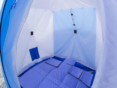 - Дно утепленное для палатки благодаря влагостойкости препятствует затеканию воды, защищая от влаги рыбацкое снаряжение и личные вещи.